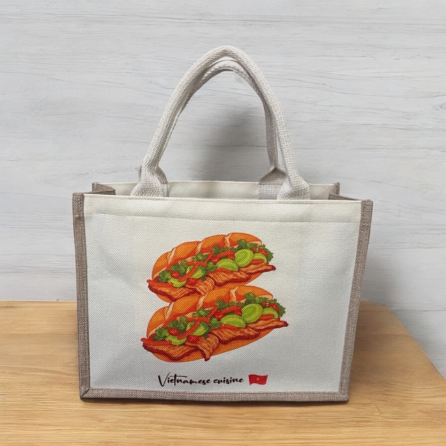 ベトナムの魅力を持ち歩こう!麻綿製バインミーデザインエコバッグ ベトナムの名物サンドイッチ「バインミー」が描かれた、可愛くておしゃれなエコバッグが登場!麻綿の生地で作られており、環境にも優しく、肌触りも抜群です。シンプルなデザインながら、カラフルなバインミーが目を引くアクセントに。 特徴: 【サイズ】ちょうど良いサイズで、日常のちょっとしたお出かけやお買い物にぴったり! 【素材】防水かつ丈夫でありながら柔らかい麻綿素材で、長持ちかつエコフレンドリー。 【デザイン】ユニークで魅力的なバインミーのイラストが、他にはないオリジナル感を演出。 普段使いはもちろん、ピクニックやエコバッグとしても活躍。ベトナム料理好きやエコ意識の高い方へのプレゼントにも最適です。 さあ、このエコバッグでベトナムの風を感じながら、毎日のお出かけをもっと楽しくしましょう! サイズ: • 高さ: 25.6cm • 幅: 13cm • マチ: 10cm