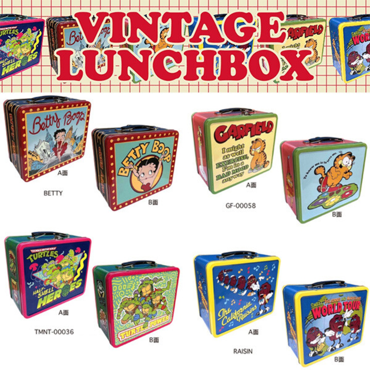 種類は、ベティブープ、ガーフィールド、タートルズ、カリフォルニアレーズンの4タイプ。