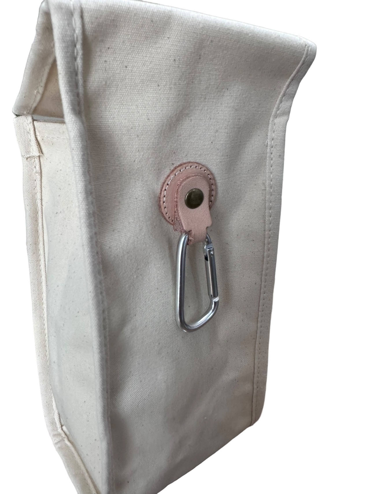 中は大きなスペースと手前の小物を入れるスペースに分かれていて、裏面にはレザーでできた留め具でカラビナが付いてるの!